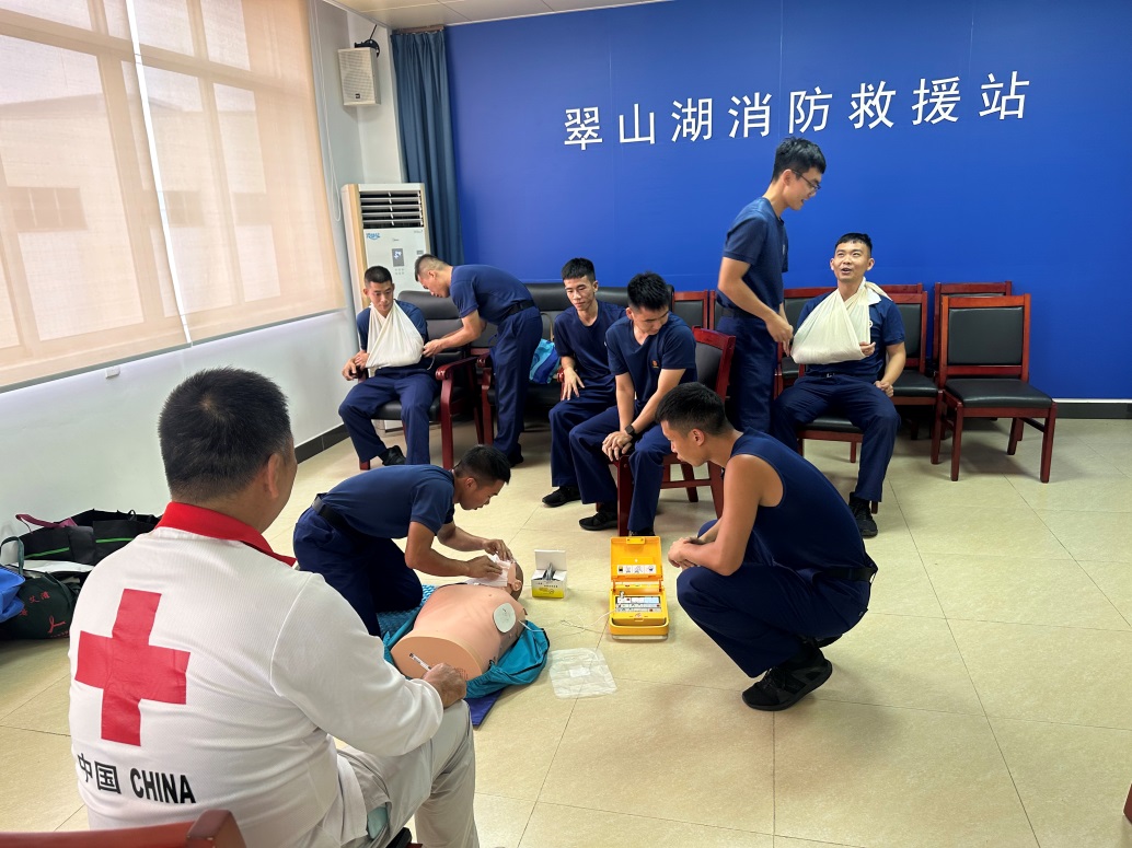 此次培训针对消防人员的特殊职业性质以及救援现场的特点和需要,制定了精准化授课内容,培训内容涵盖了理论授课、实操练习和现场考核三大环节,确保培训效果的精准性及实用性。活动现场,红十字应急救护师资深入浅出地讲解了红十字运动知识、心肺复苏、气道梗阻、创伤救护以及常见急症和意外伤害的急救处理等救护技能,随后,将学员进行分组操作练习,手把手教导每位学员熟悉并掌握心肺复苏、AED使用、海姆立克急救法、止血包扎、固定搬运等重要操作技能。培训现场气氛热烈,学员们学习热情高涨,相互合作,在一遍遍的练习中提升了自己的操作技能。