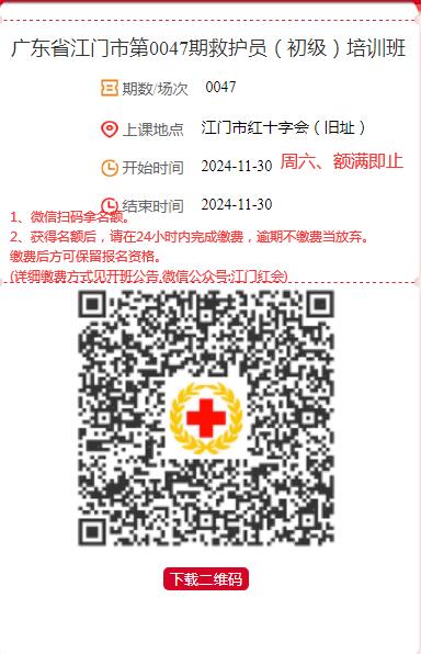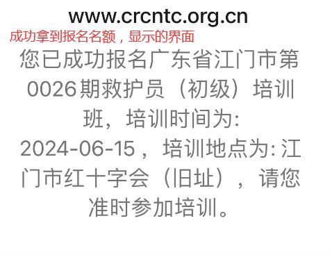 三、培训地点(旧址):江门市蓬江区象山新村122号二层江门市红十字会(建议先到江门市农林小学,农林小学正门斜对面的美华景家具,进巷即可见)或导航:江门市红十字会生命安全体验馆(同一位置)。小车停车位较紧张,请预留充足时间停车,建议尽量采用摩托车前往。
